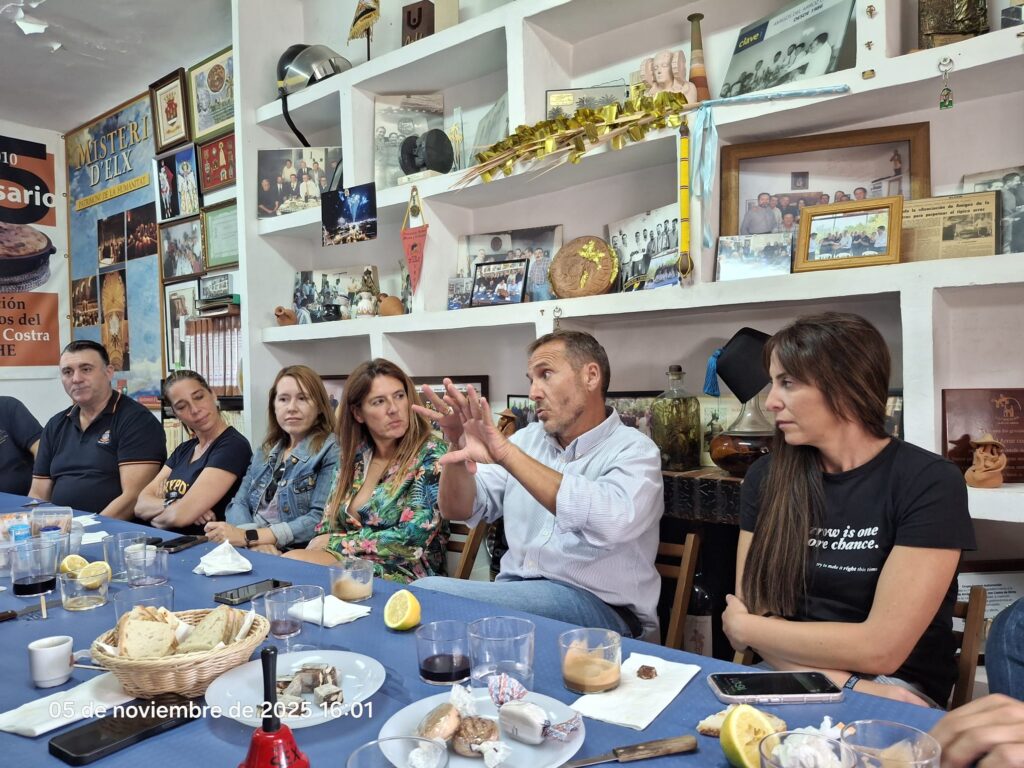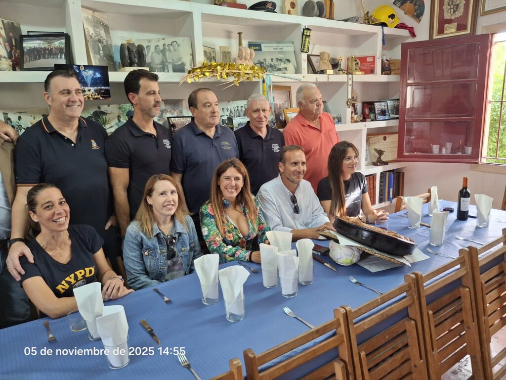 La Asociación de Amigos del Arroz con Costra recibió este miércoles, 3 de noviembre, a cinco agentes de la Policía Local de Elche, adscritos al Departamento de Comunicación y Gestión de Calidad. En esta ocasión, además de disfrutar del tradicional plato ilicitano, la jornada sirvió para conocer de cerca la labor de servicio público que desempeñan los más de 400 agentes que forman parte del cuerpo.